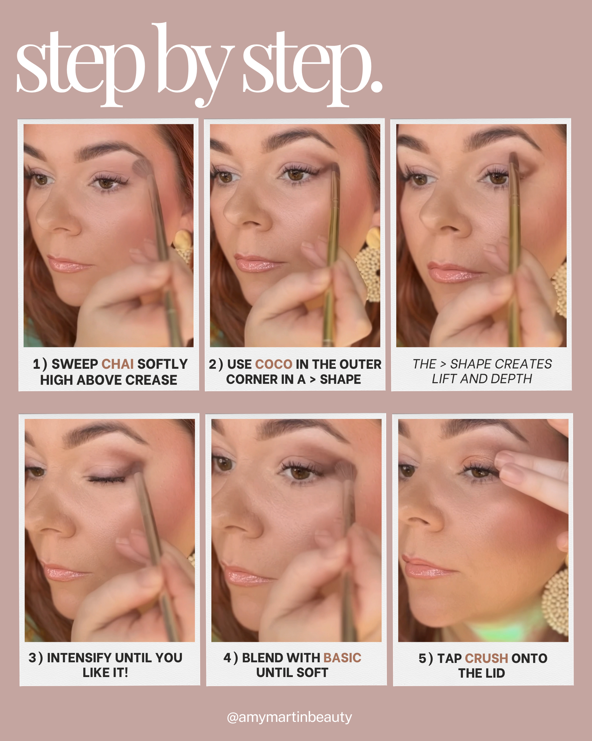 With a flat brush like the Multitasker Brush, apply Coco in the outer corner in a > shape. Weβre creating lift AND depth with this shade β this depth mimics a higher crease which lifts the eye.